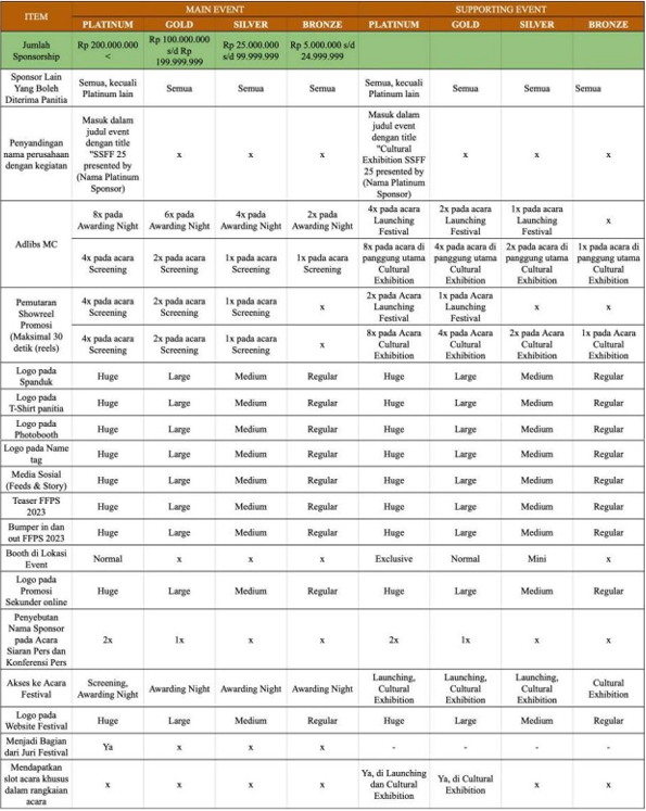 AvailableSupport the future of Sumedang cinema and connect your brand with a passionate, creative, and growing audience. As an official sponsor, your brand will gain strong visibility, community impact, and a place in the heart of the festival.